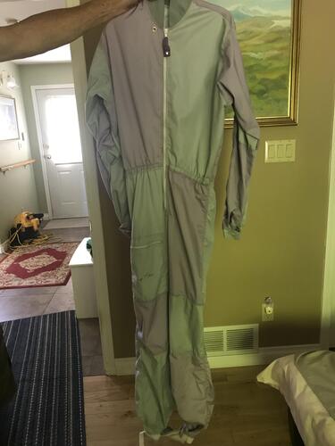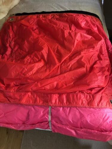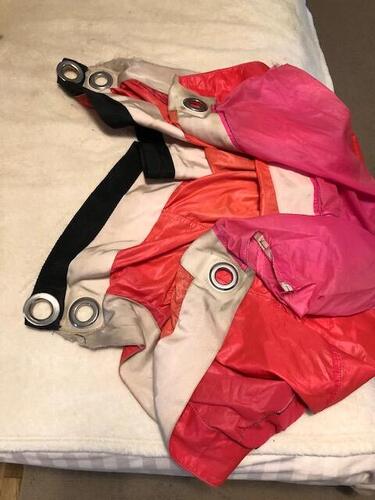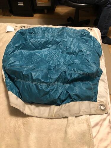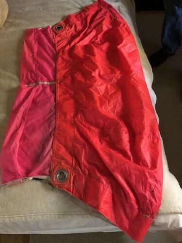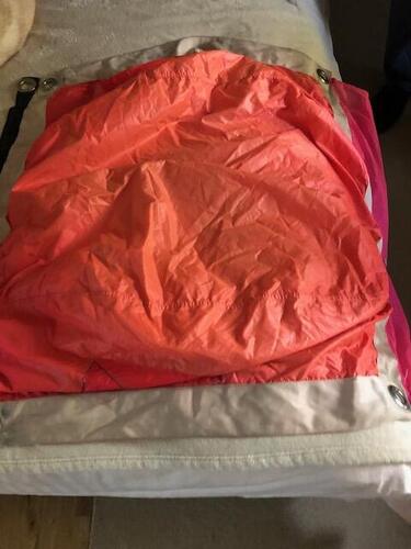 Red one measures approx. 32" x 36" from grommet to grommet. It does have 2 rigger repaired patches on it.