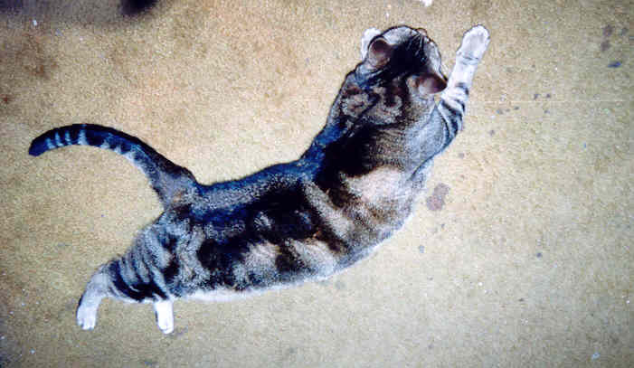 PLFXpert 0 #30 October 11, 2002 Don't get me started. I love animals and I freakin LOVE my kitty cat. His name is Sabre and he wears a little skydiving pin on his colar. He is like a dog. He follows me throughout the house. He comes when you call him. He likes to go for walks in his carrier (it's one of those mini-rig backbacks that I stick him in and I wear it on the front and he sticks his head out and hangs out.) He likes to shower with me. He sits on my tummy when I'm in the tub. He sleeps with me all night. He jumps REALLY high. He is tiger striped w/ white paws and SUPER-SOFT fur. He's very furry with a big fluffy tail I keep his picture in my log book. I keep his picture in my wallet. He gets Whiskas gourmet homestyle breakfast and dinner. He gets treats for jumping high. He is SUCH a lap kitty. He lays on your rig and acts as a weight while you pack. He weighs 12 pounds. He has his own little house and a billion toys. He brings a toy to bed every night and it sleeps with us. We hung a bird feeder outside the living room window so he can sit and watch the birdies. If there is a roach in the house, he finds it, sticks his paw on it and meows for me to capture it. I LOVE MY KITTY, SABRE! He he he. I want a dog, but I have to wait until I can get a bigger place. Quote Share this post Link to post Share on other sites