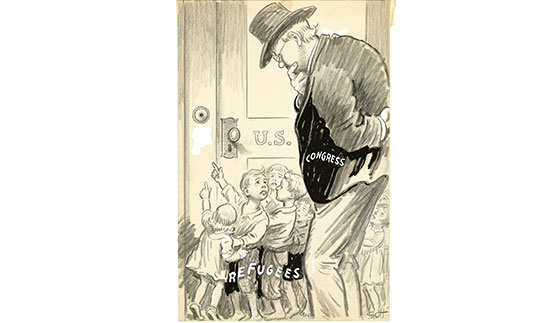 Political cartoonist John Knott had little sympathy for the U.S. Congress’ indecision when it came to the Wagner-Rogers Child Refugee Bill, a piece of 1939 legislation that would have opened slots for 20,000 German refugee children to enter the United States. The bill was opposed by anti-immigrant organizations and never became a law. Tens of thousands of German Jewish children went on to die in concentration camps.