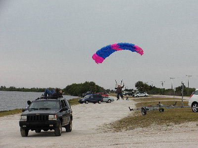 councilman24 37 #6 January 2, 2003 Talk about dangerous! If you can't see it it's a tandem being towed parasail style by an SUV along a gravel road, only about 5 ft high. Parasailing ram airs is very dangerous. Don't try this at home. It takes skill by the driver to maintain constant tension. Imagine the SUV turning 90 degrees. The rope goes slack the, canopy continues, the rope goes tight at 90 degrees to the line of flight of the canopy. What happens when you drag a ram air side ways throught the air. That being said, it's kind of fun. I'm old for my age. Terry Urban D-8631 FAA DPRE Quote Share this post Link to post Share on other sites