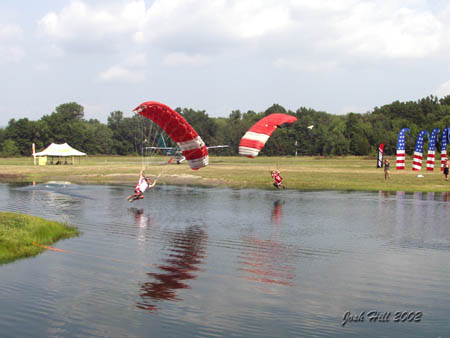 jdhill 0 #2 October 7, 2002 Was there, saw it, have video, have pictures from a differnet angle (on my web site)... they did not swoop directly at each other... they actually had quite a bit of separation... JC carved around one side of the pond while Clint carved the other... both made it to the opposite shoreline, although I don't remember Clint's landing to be very soft... was very cool to watch. I would not recommend trying this at home. JoshAll that is necessary for the triumph of evil is that good men do nothing. - Edmund Burke Quote Share this post Link to post Share on other sites